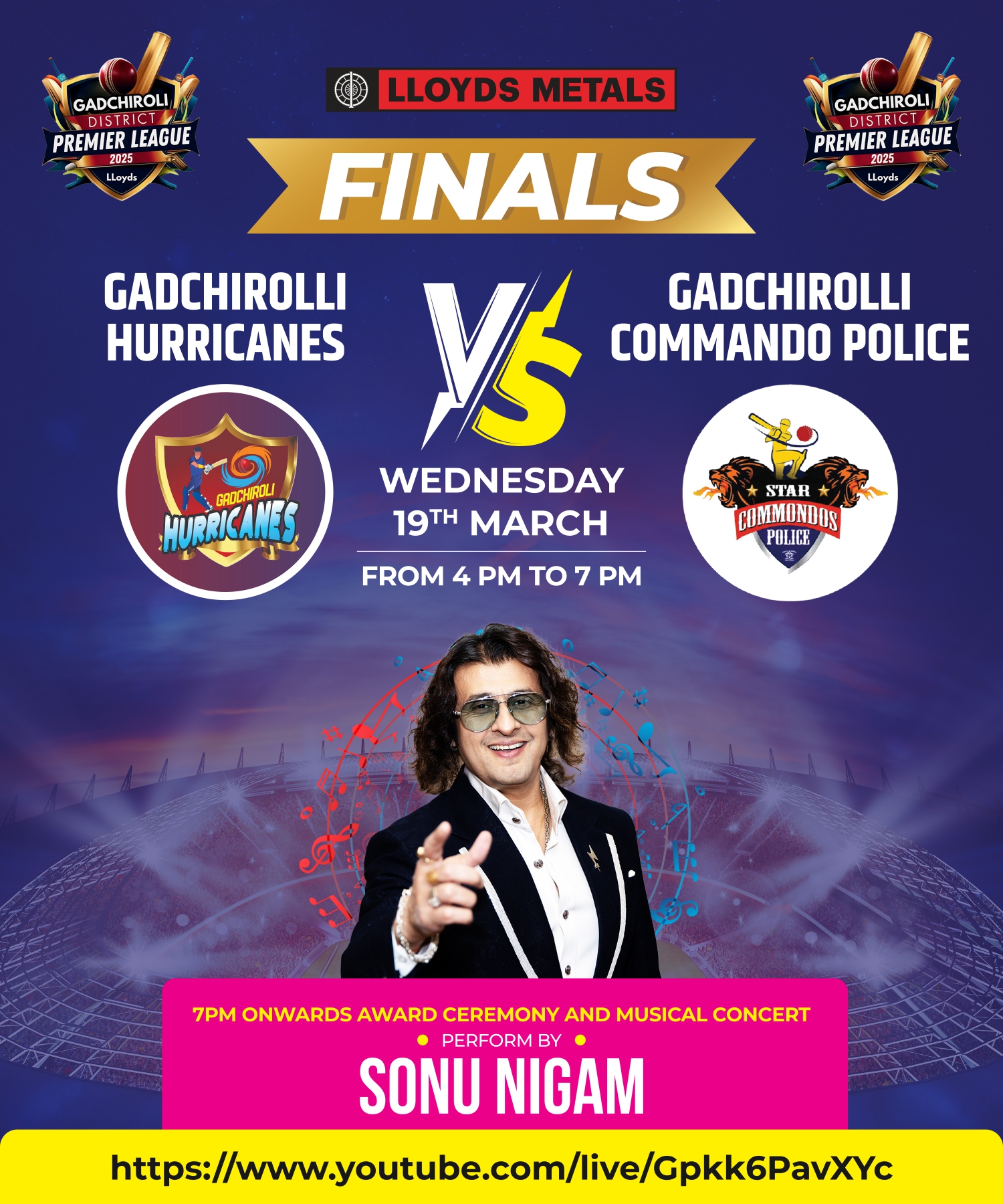 गडचिरोली जिल्हा प्रीमियर लीगचा एका रोमांचकारी अंतिम सामन्यात समारोप होत असताना गडचिरोली जिल्हा क्रीडा आणि मनोरंजनाच्या अभूतपूर्व संध्याकाळसाठी सज्ज झाला आहे. महाअंतिम सामन्यातील पुरस्कार समारंभ आणि दिग्गज गायक सोनू निगमच्या ऐतिहासिक संगीत मैफलीला २०,००० पेक्षा अधिक लोकांची गर्दी होणार असल्याचा दावा आयोजकांनी केला आहे. हा कार्यक्रम १९ मार्च २०२५ रोजी MIDC मैदान, गडचिरोली येथे होणार आहे.