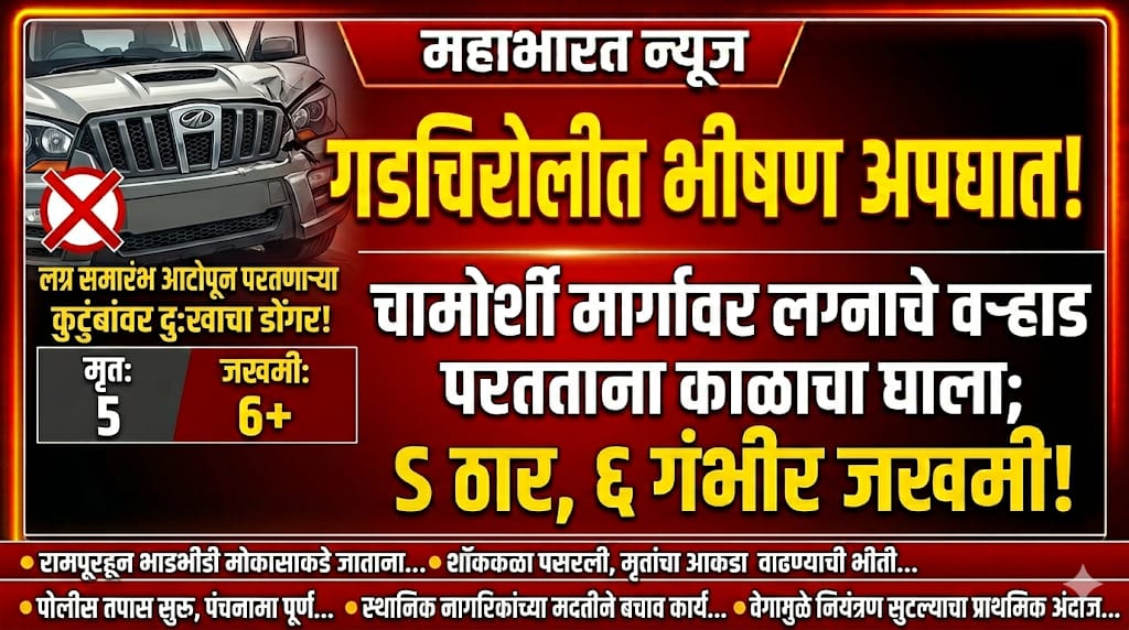 गडचिरोली–चामोर्शी मार्गावर आज सायंकाळी भीषण अपघात होऊन पाच जणांचा मृत्यू तर सहा जण गंभीर जखमी झाल्याची दुर्दैवी घटना घडली. या अपघातामुळे संपूर्ण परिसरात हळहळ व्यक्त होत असून मृतांचा आकडा वाढण्याची भीती व्यक्त केली जात आहे.