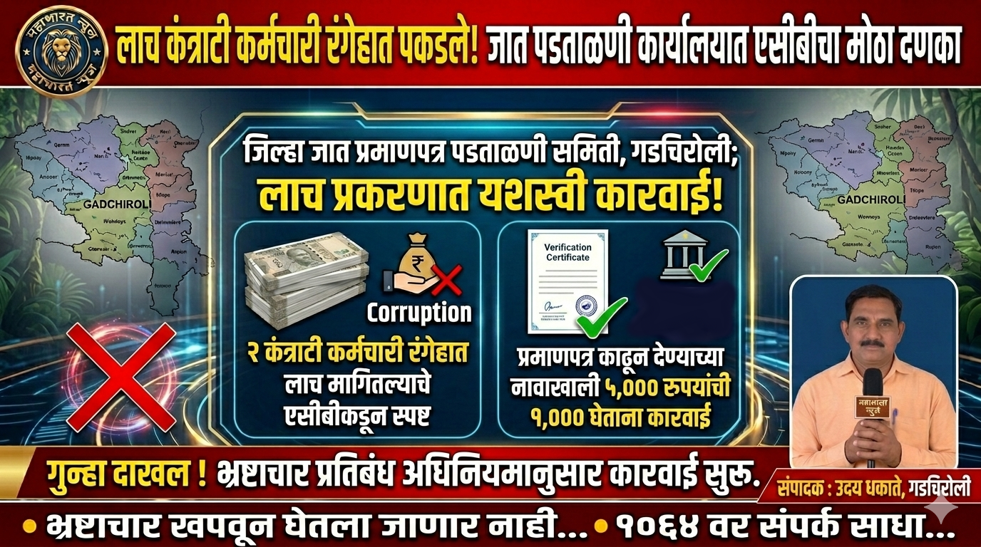 जिल्हा जात प्रमाणपत्र पडताळणी समिती कार्यालय, गडचिरोली येथे जात पडताळणी प्रमाणपत्र काढून देण्यासाठी लाच मागितल्याप्रकरणी अॅन्टी करप्शन ब्युरो (एसीबी) पथकाने दोन कंत्राटी कर्मचाऱ्यांना रंगेहात पकडले आहे. ही कारवाई ३ एप्रिल २०२६ रोजी पहाटे करण्यात आली.