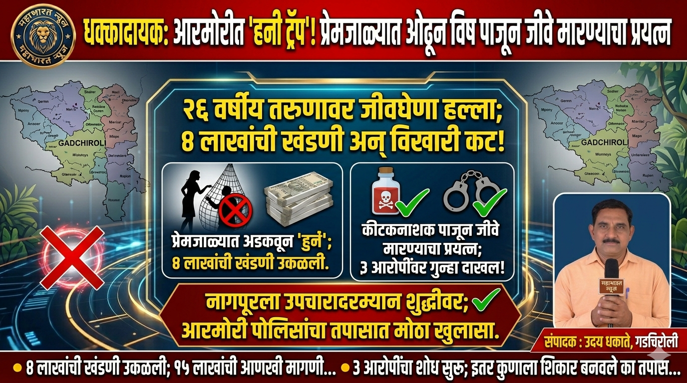प्रेमाच्या जाळ्यात ओढून एका तरुणाला ‘हनी ट्रॅप’मध्ये अडकवणे, त्यानंतर बदनामीची भीती दाखवत लाखो रुपयांची खंडणी उकळणे आणि शेवटी मागणी पूर्ण न झाल्याने त्याचा जीव घेण्याचा प्रयत्न करणे, असा अत्यंत धक्कादायक प्रकार आरमोरी येथे उघडकीस आला आहे. आरोपींनी संबंधित तरुणाला बेदम मारहाण करून बळजबरीने कीटकनाशक पाजल्याची घटना ३ एप्रिल रोजी समोर आली असून, या प्रकरणी आरमोरी पोलिसांनी एका तरुणीसह तिच्या दोन साथीदारांविरुद्ध गुन्हा दाखल केला आहे.